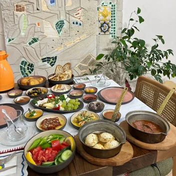 Taş sokakların huzurlu atmosferinde, Anadolu’nun meşhur lezzetlerinden ilham alan sınırsız serpme kahvaltımızda; peynir tabağı, söğüş tabağı, doğal fermantasyonla hazırlanan Malatya bez sucuk, zeytin salatası, biberiyeli patates salatası, üç farklı çeşitten oluşan sıcacık pişi, dışı çıtır içi yumuşacık yumurtalı ekmek ve geleneksel yumurta kapama bulunur. 🧀🍅🌿🥚
